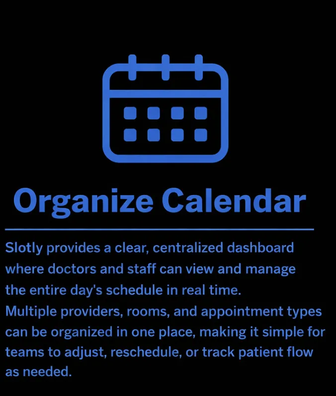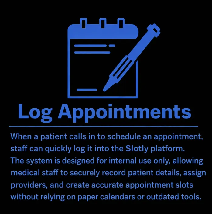 Slotly is built with HIPAA-conscious design principles. All appointment data is stored securely in the cloud using encrypted connections, and staff control all scheduling internally.